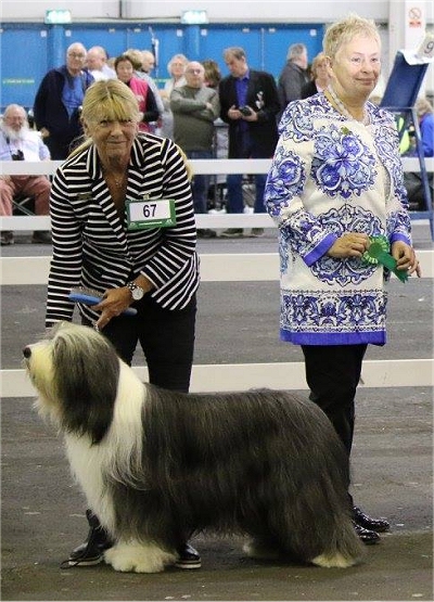 It was lovely to show under Rosie, someone who has been involved in the breed for many years. Russell, CH Potterdale Platinum Plus won CC, BOB and Group 3. It meant a lot to recieve this lovely critique especially as she awarded the first CC to CH Potterdale Privilege almost 20 years ago. "This 4 year old slate dog is an outstanding example of the Breed and very much my type. He is so well-balanced in every department. Lovely shaped head, good eye colour and pigment. Arching neck into very well laid shoulders. Super topline, correct rear angulation and well set hocks. He is a joy to behold on the move and I was pleased to award him the DCC and BOB and to see he was placed third in the Pastoral Group."